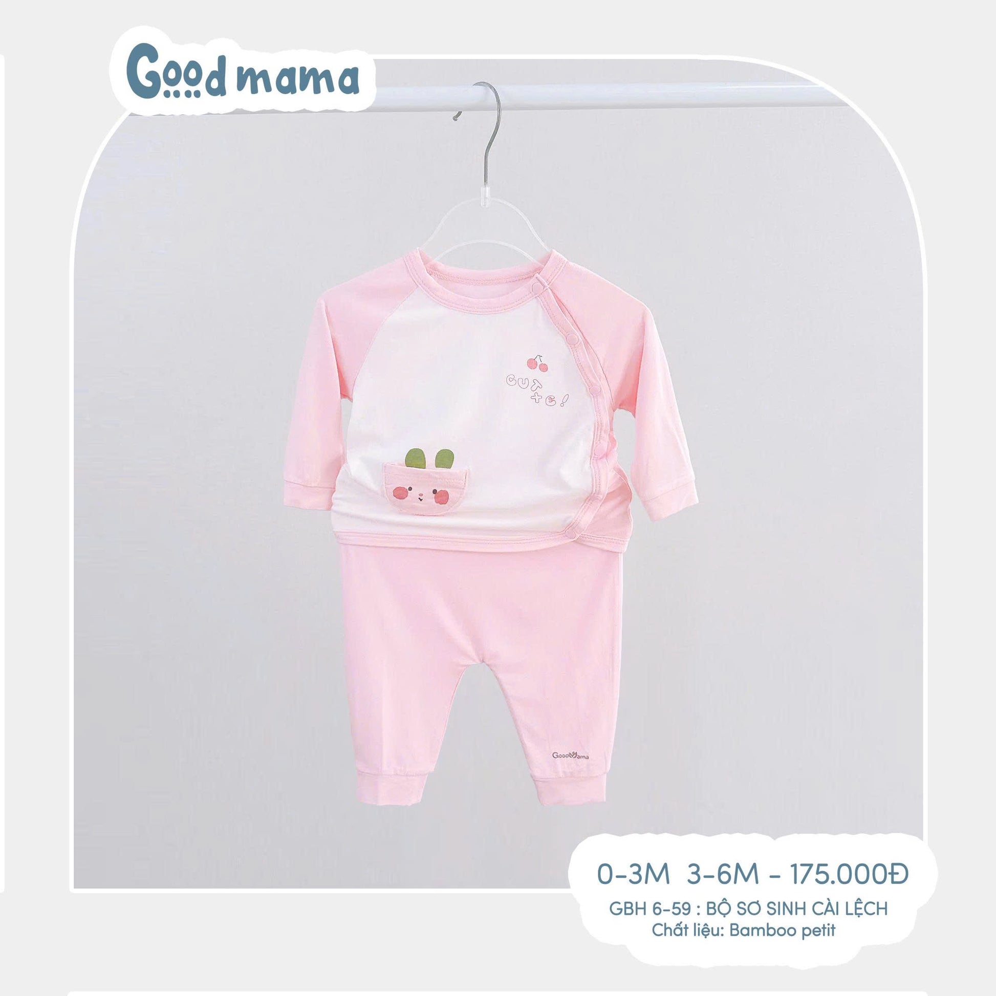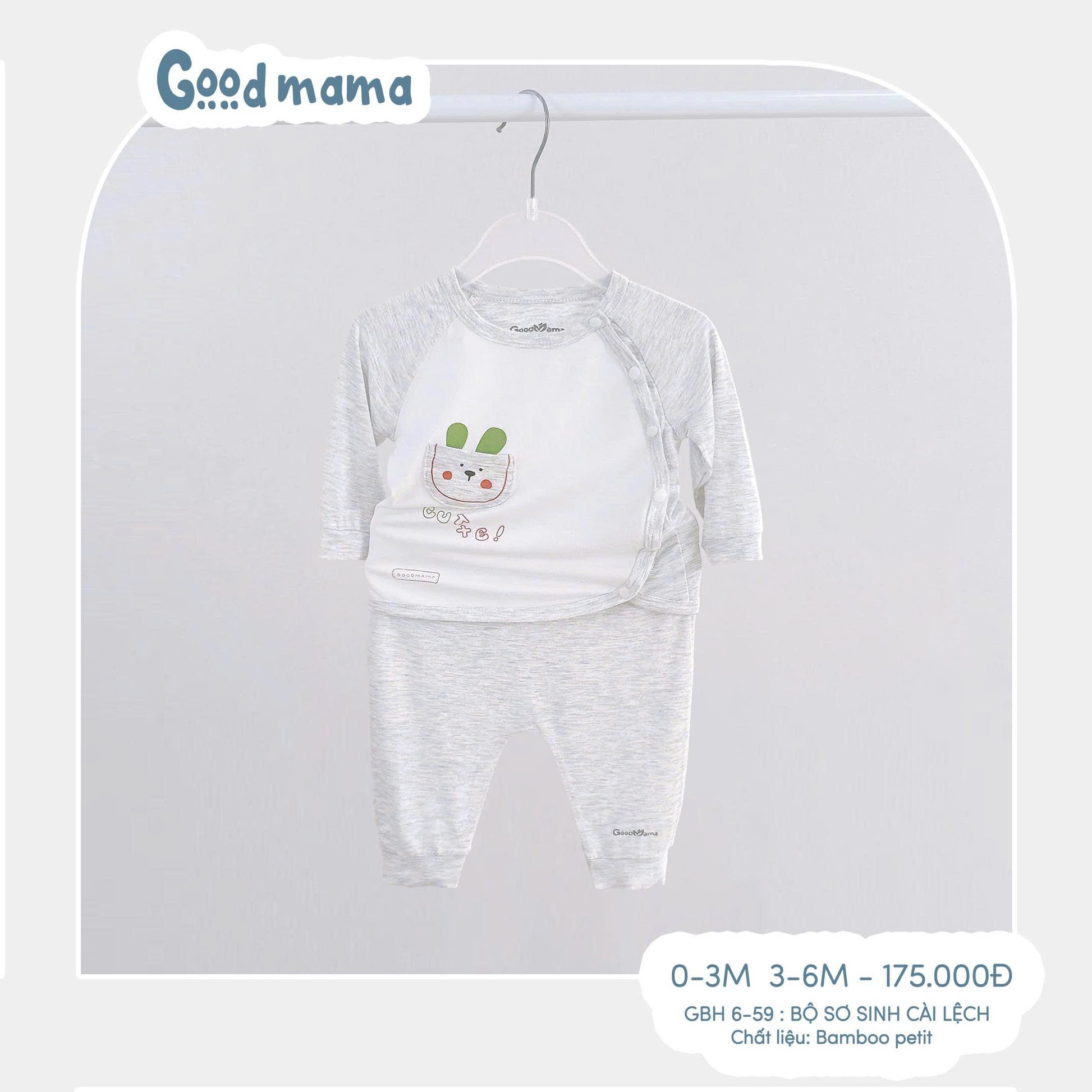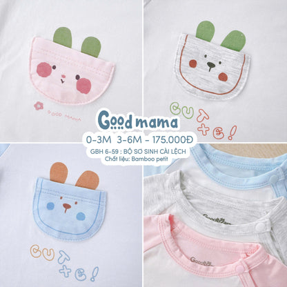 👕 GBH6-59 – Bộ sơ sinh cài lệch Goodmama được làm từ Bamboo Petit cao cấp, mềm mịn, thoáng khí và thấm hút tốt, giúp bé luôn khô thoáng khi nằm ngủ hay vận động.