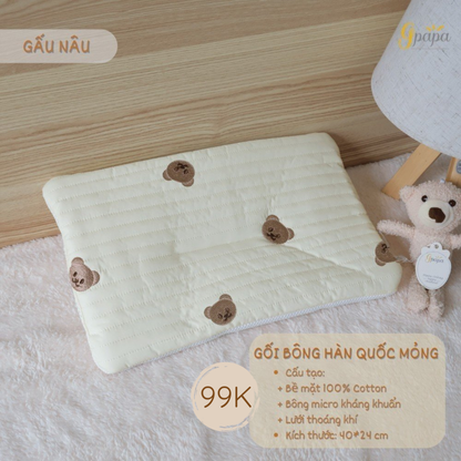 Gối Bông Hàn Quốc Mỏng Gpapa Bề Mặt 100% Cotton, Ruột Bông Micro Kháng Khuẩn, Lót Lưới Thoáng Khí